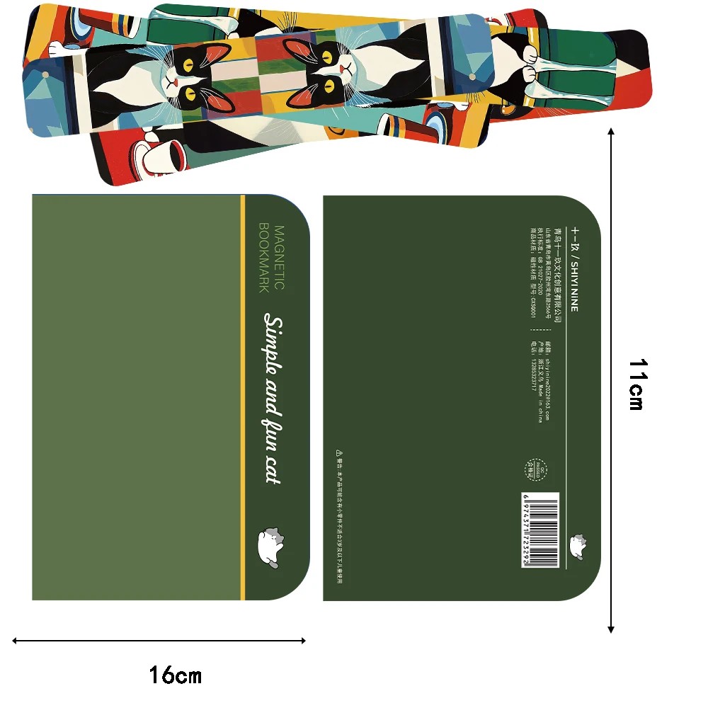 Sats 5 st magnetisk bokmärke 12 x 2 cm vikbar form katt färgglad illustrativ motiv Sats med fem magnetiska bokmärken är ett praktiskt tillbehör för daglig läsning och studier. Tack vare magnetisk fäste håller bokmärkena på sidan och hjälper till att markera den exakta platsen utan att flytta på sig. Den vikbara konstruktionen gör det enkelt att fästa på bladets kant, så bokmärket är väl synligt och hindrar inte vid bläddring. De färgglada illustrationerna med kattmotiv ger satsen ett lekfullt utseende som glädjer både barn och vuxna. Bokmärkena passar i böcker, häften, kalendrar och anteckningsböcker.