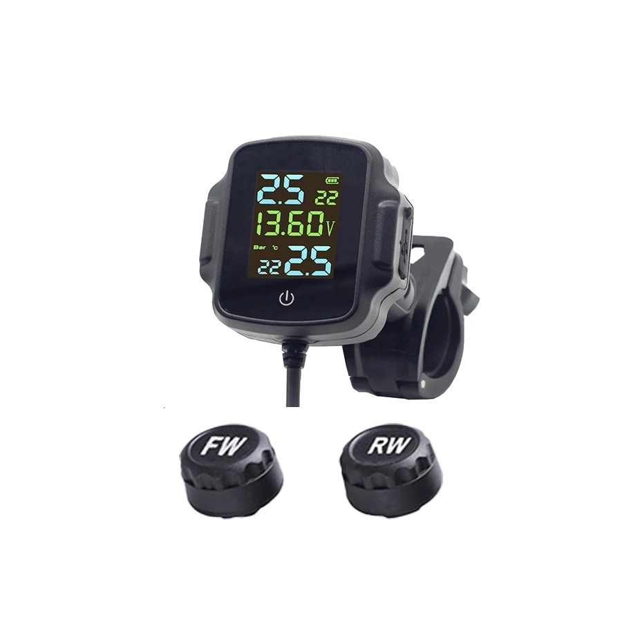 Denna sats för däcktryckssensorer är avsedd för motorcyklar och används för kontinuerlig övervakning av tillståndet för det främre och bakre däcket under körning. Den tydliga färgskärmen visar det aktuella däcktrycket, deras temperatur och spänningen på motorcykelbatteriet i realtid. Systemet varnar automatiskt för farliga värden som kan påverka stabiliteten, hanterbarheten och livslängden på däcken. Trådlösa externa sensorer möjliggör enkel installation utan behov av att demontera hjulen. Inkluderar även en USB-utgång för att ladda externa enheter under körning.
