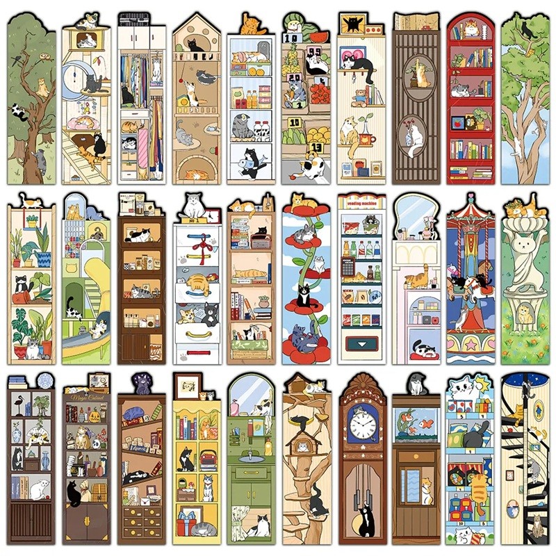 Sats med 30 st pappersbokmärken 15 x 4 cm kattillustration interiör bibliotek träd Satsen med trettio pappersbokmärken erbjuder en färgglad samling av illustrationer med kattmotiv, som kommer att glädja både läsare och älskare av originell grafik. Varje bokmärke har en enhetlig storlek 15 x 4 cm, vilket gör det bekvämt att använda i böcker av olika storlekar. Illustrationerna är i en mjuk, lekfull stil och visar katter i olika vardagliga och fantasifulla miljöer. Pappersutförandet ger en lätt känsla och är lämpligt för vanlig läsning hemma, i skolan och på resor. Motiven på bokmärkena fångar katter i hemmet, bland böcker, på hyllor, i skåp, bibliotek och arbetsvrår. En del av illustrationerna visar katter klättrande i träd, vilande på grenar eller gömda i naturliga miljöer. Andra motiv arbetar med lekfulla scener, som katter i affärer, bland vardagsföremål, vid klockor, akvarier eller dekorativ möbel. Det saknas inte heller stiliserade rum med hyllor fulla av böcker, lådor och små detaljer som ger illustrationerna djup och berättelse.
