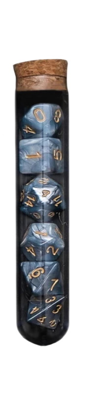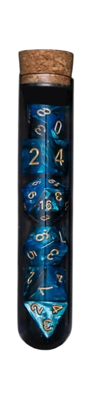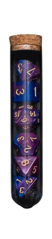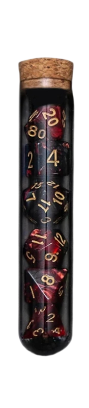 Denna sats representerar en kombination av funktionellt spelmaterial och ett tematisk fantasyelement. Flaskan kan användas inte bara för att förvara tärningarna, utan också som dekoration på spelbordet. Tärningarna kan enkelt kombineras med andra spelmaterial och passar naturligt in i fantasymiljön. Helheten ger ett enhetligt, överskådligt och visuellt intressant intryck. Satsen är ett perfekt val för spelare som vill förena spelens funktionalitet med atmosfären av fantasyvärlden.