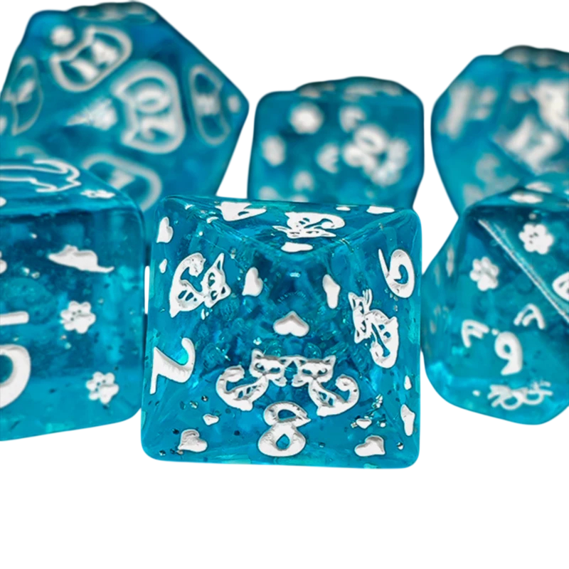 Den ljusblå satsen med mångsidiga tärningar med kattmotiv gläder RPG-spelare, fantasyvärldar och Drakborgen vid varje kast. Fullständig beskrivning