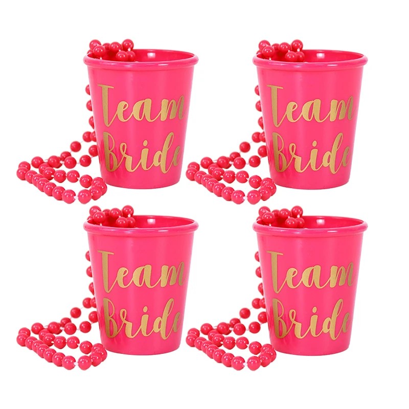 Set med 4 st Plastiska festkoppar med snöre Brudens team Dryckeskopp för svensexa