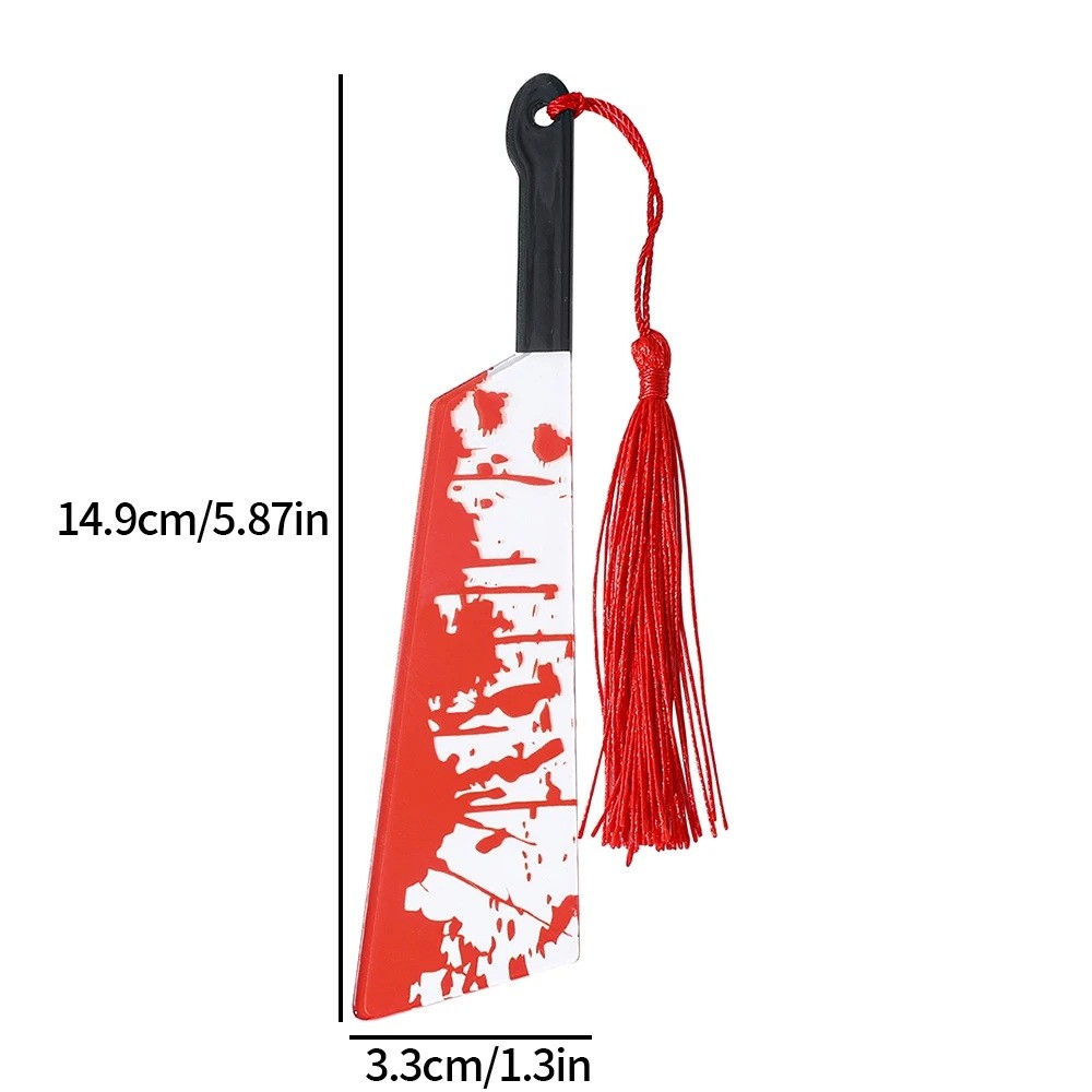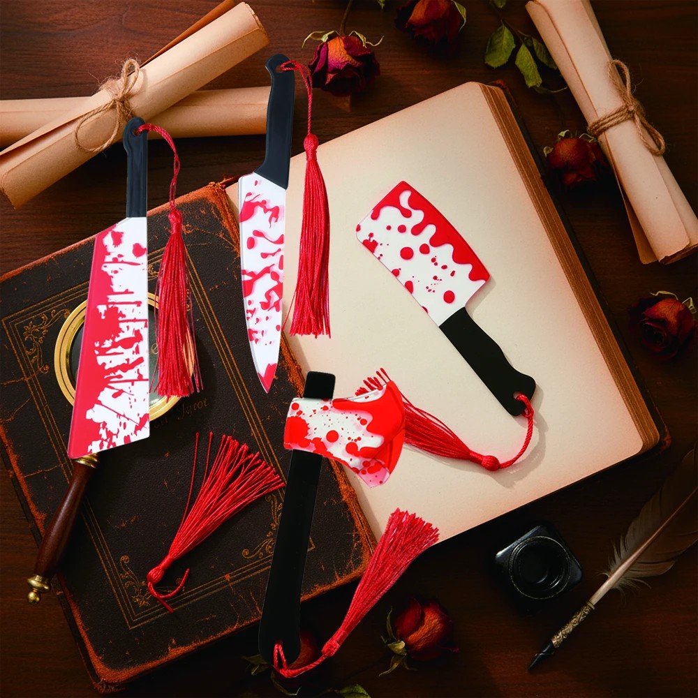 Set med fem tematisk bokmärken är designat för läsare som älskar skräckberättelser, thrilleratmosfär och samlarobjekt till böcker. Varje bokmärke har en längd av 15 cm och bär ett distinkt skräckmotiv inspirerat av film- och bokestetik – stiliserade former som påminner om en hacka, kniv, såg, machete och yxa. Den kompletterande tofsen hjälper till att snabbt hitta den påbörjade sidan och ger samtidigt bokmärket ett dekorativt utseende. Produkten fungerar endast som bokmärke för att markera platsen i boken och är inte avsedd för något annat bruk.
