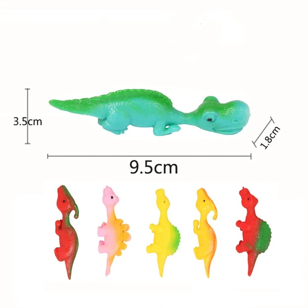 Denna roliga set med utdragbara dinosaurier för fingrar kommer att glädja varje barn som älskar glada färger och enkla spel. Varje dinosaurie är flexibel, lätt att dra tillbaka och kan skjutas iväg som en liten slunga. Perfekt för gemensamt spel, tävlingar och barnfester.