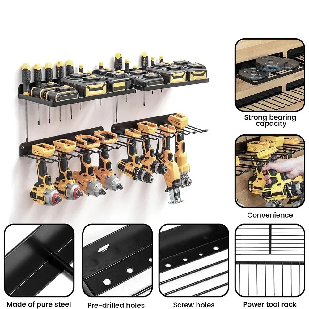 Hållbart set med metallhylla och hållare med krokar för förvaring av batteridrivna borrmaskiner och verktyg. Praktiskt lösning för verkstad och garage. Fullständig beskrivning