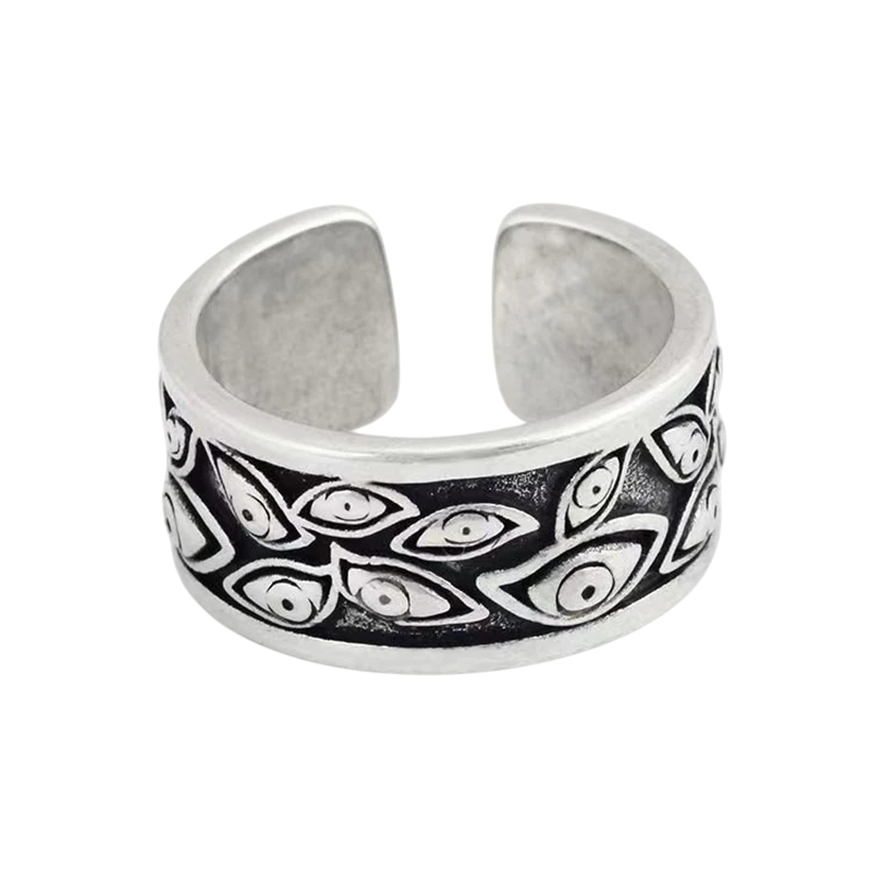 Silverring Devil Eyes med justerbar manschett, tillverkad av zinklegering, erbjuder modern stil och kvalitetsdesign för vardagligt bruk. Fullständig beskrivning