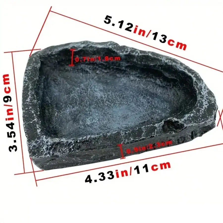 Denna terrariskål med realistiskt stenliknande utseende är designad för daglig utfodring och vattning av reptiler. Den naturliga designen som efterliknar sten smälter lätt in i vilket terrarium som helst och skapar en lugn och naturlig miljö. Skålen är lämplig för skäggagamer, mindre ödlor, ormar och andra små reptiler. Tack vare den praktiska formen är den lättillgänglig och enkel att hålla ren. Den fungerar både som funktionell utrustning och dekorativt inslag.