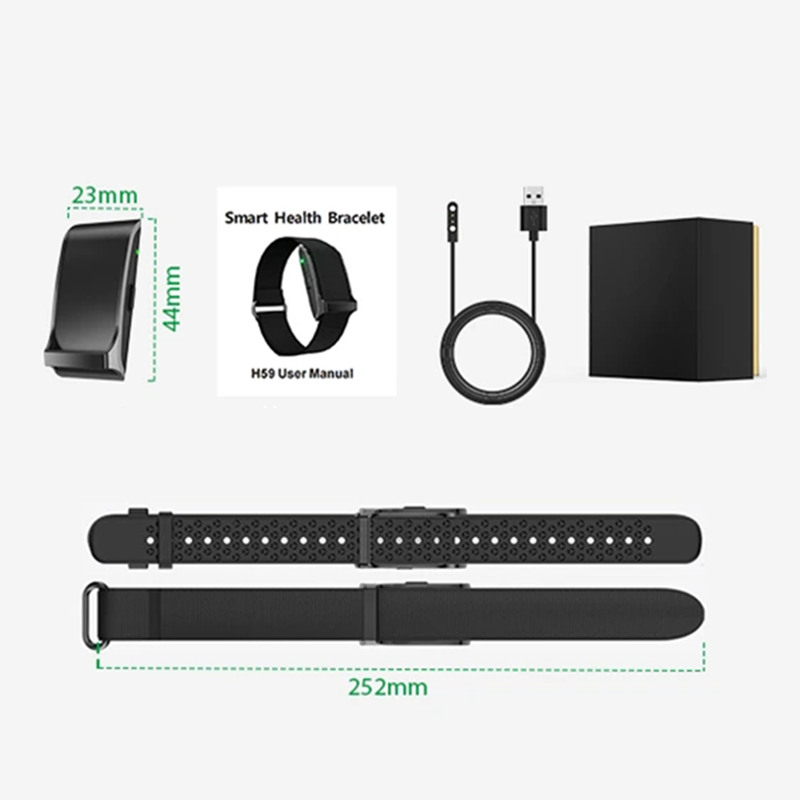 Innehåll i förpackningen: smartarmband, 2 utbytbara band, laddkabel, användarmanual