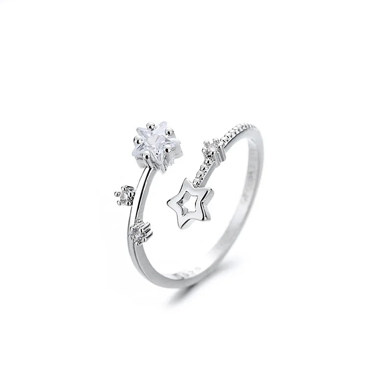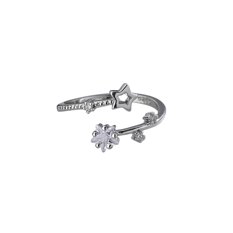 Smyckring i silver för kvinnor, diameter 16,5 mm, stjärnor 3/5 mm, justerbar storlek, tunn öppen ring med kristall- och ihålig stjärna samt mini-kristaller