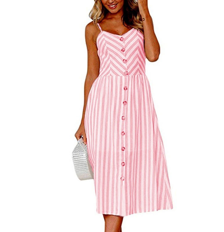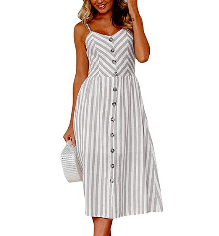 Sommarklänning för kvinnor med remmar och knappar. Midi-klänningar blir aldrig tråkiga!