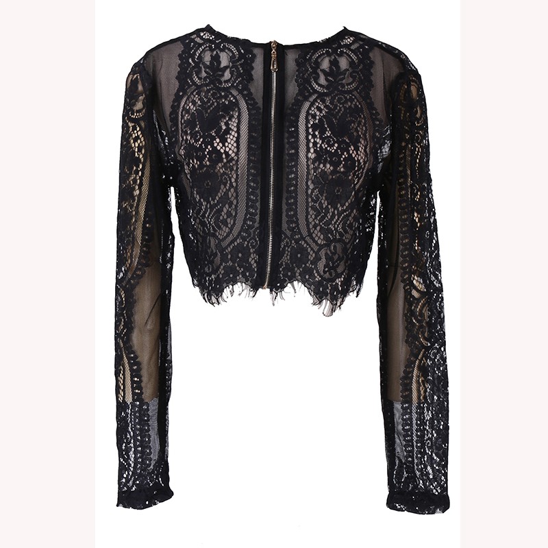Det är helt i spets, med långa ärmar och dragkedja framtill.
