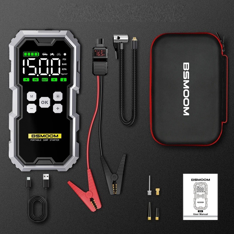 - Innehåll i förpackningen: startbatteri med kompressor, smarta startklämmor, slang för pumpning, uppsättning av ventiltillbehör, laddningskabel, användarmanual och skyddande fodral.