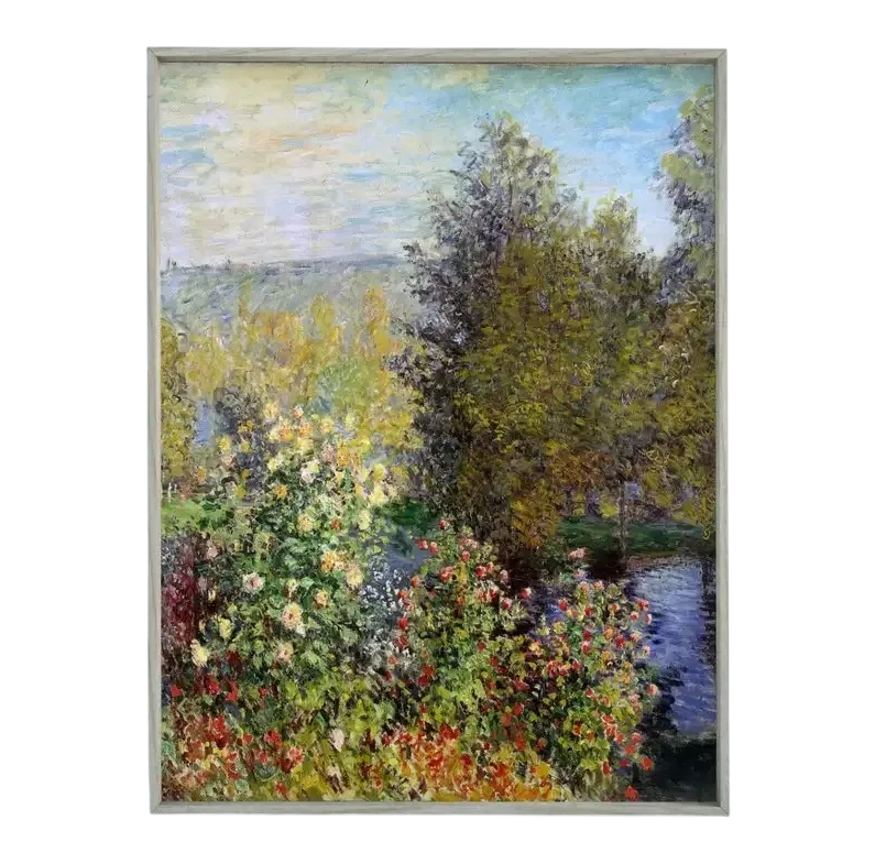 Stort väggplakat 50 x 70 cm Trädgård i Montgeron Claude Monet stil Vertikalt canvastryck utan ram Impressionism väggplakat är inspirerat av motivet „Trädgård i Montgeron“, som hämtar sin inspiration från Claude Monets impressionistiska verk. Scenen, fylld av blommande buskar och mjuk naturlig grönska, ger rummet harmoni, lätthet och en känsla av lugn. Tack vare det större vertikala formatet blir plakatet en framträdande dekorativ detalj som passar i vardagsrum, sovrum och arbetsutrymmen. Kvalitativt canvastryck fångar troget de mjuka färgövergångarna och den måleriska atmosfären som är typisk för impressionismen. Plakatet levereras utan ram, vilket gör det möjligt att välja egen inramning eller modern minimalistisk upphängning.