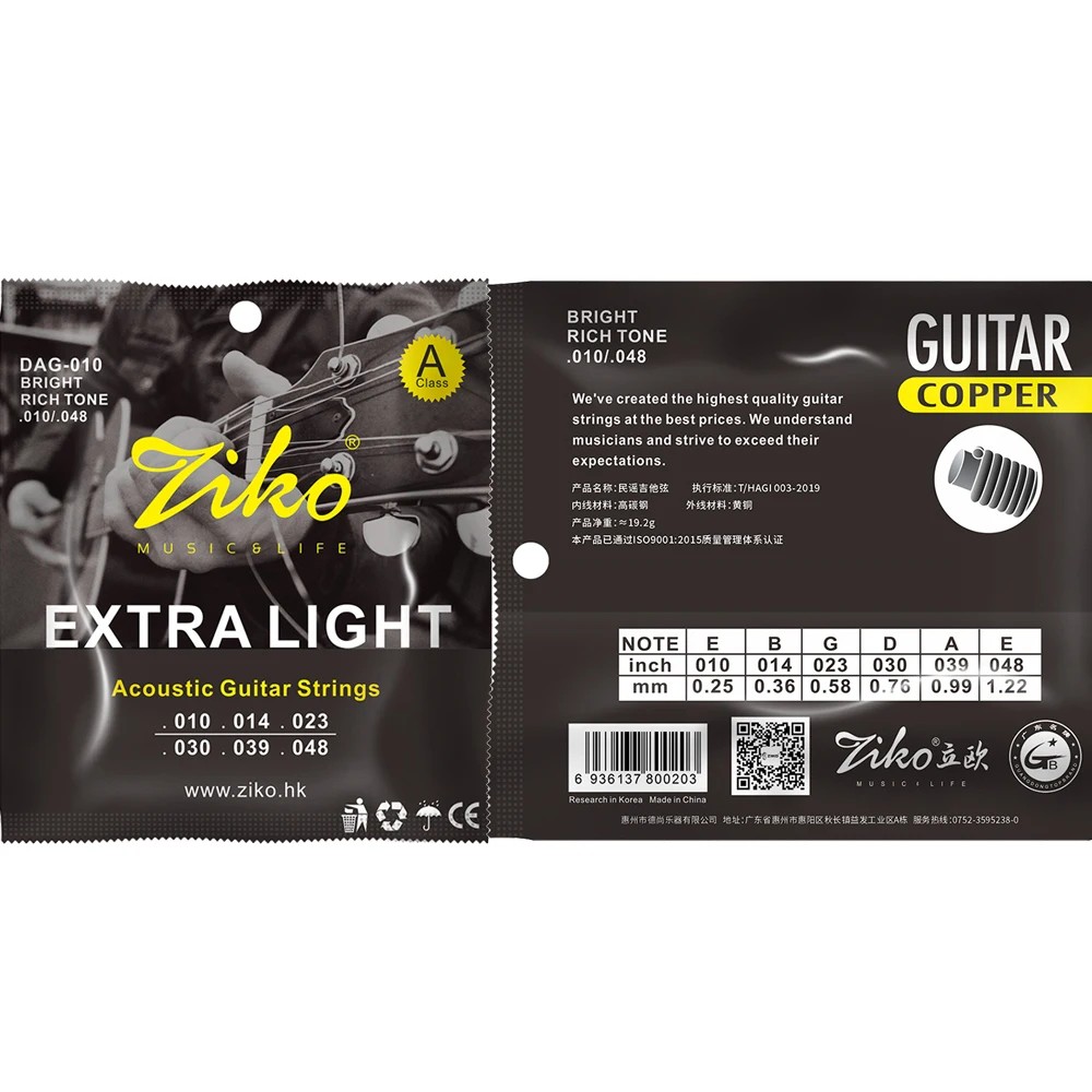 Denna modell DAG-010 är lämplig för alla typer av akustiska gitarrer och uppskattas av både nybörjare och avancerade spelare. Strängarna ger utjämnat spänning över hela tonomfånget och garanterar bekväm spelning med fingrar eller plektrum. Tack vare noggrant utförande erbjuder de ren, naturlig och klar ljud som passar utmärkt för både ackompanjemang och solo-spel.