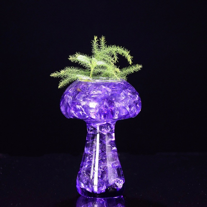 Dekorativt dryckesglas fångar uppmärksamheten med sin ovanliga design inspirerad av svampformen. Den övre delen som påminner om svampens hatt övergår smidigt till den smalare nedre delen, vilket skapar en distinkt silhuett vid servering av drycker. Denna design kan fungera som ett intressant visuellt inslag vid dukningen.