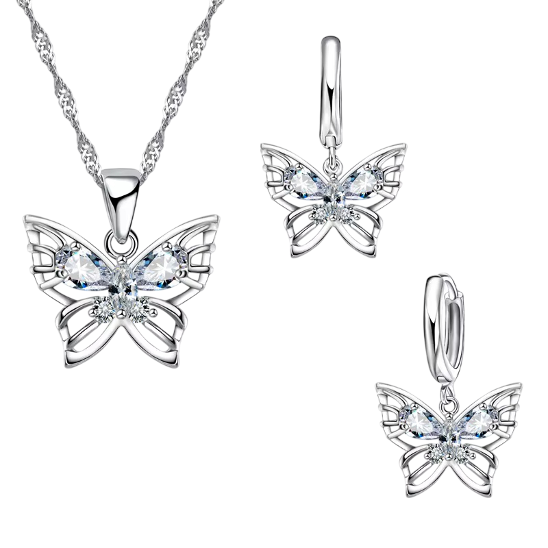 Fin silverset med fjärilsmotiv och glittrande kristall framhäver kvinnlighet vid bröllop, fest och vardagsbruk. Fullständig beskrivning