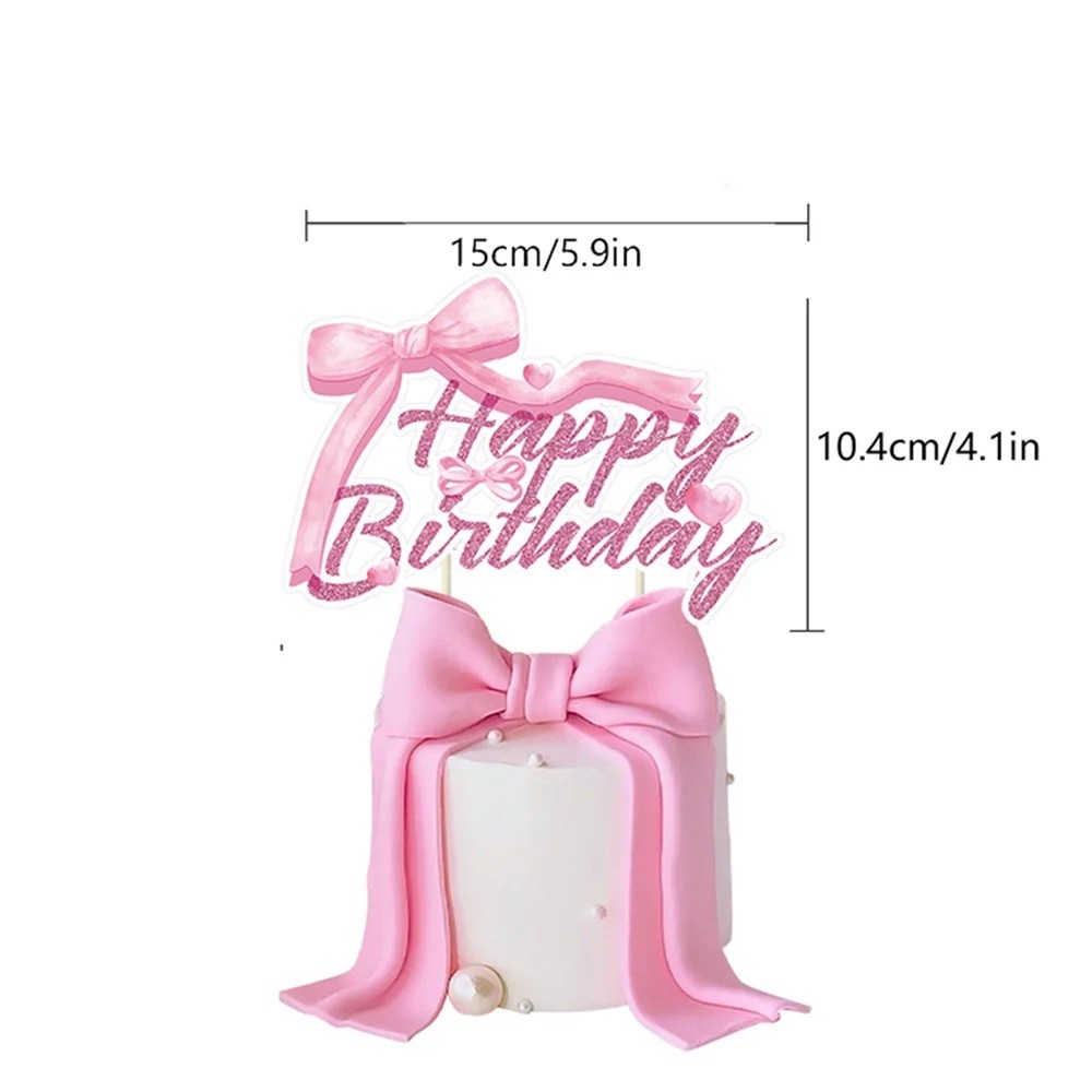 Stilfull rosa toppare med texten Happy Birthday och rosetter pryder födelsedagstårtan och ger den söta dekoren en fin festlig look. Fullständig beskrivning