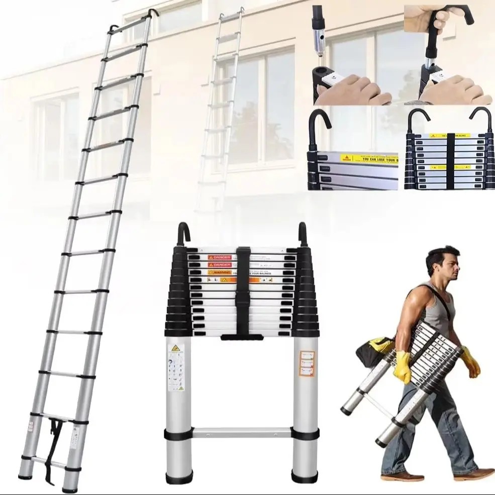 Teleskopstege 4,4 m Rostfritt stål Fällbar konstruktion 14 steg Maximal belastning 150 kg Säkerhetslås och krokar