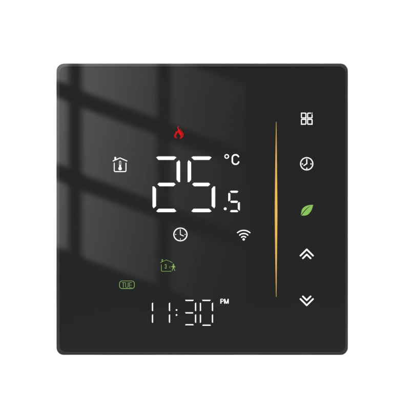 Smart termostat med Zigbee-stöd möjliggör styrning av golvvärme via app, justerbar 5+1+1-regim och fyra dagfaser. Fullständig beskrivning