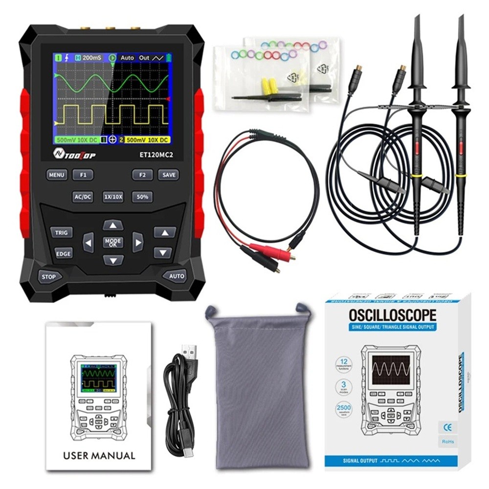 TOOLTOP ET120MC2 tvåkanals digital oscilloskop 120MHz 500MSa/s signalgenerator mini handhållen bärbar oscilloskop 2024