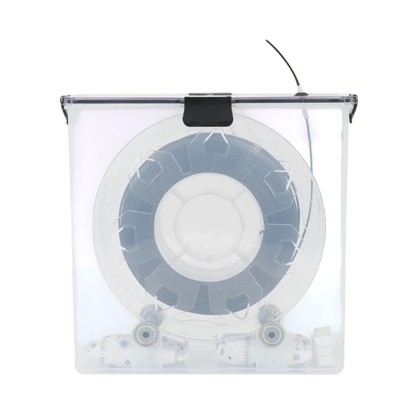 I locket på lådan finns ett hål med en gummiplugg, genom vilket en filamentledningsrör är utdragen. Användningen är enkel: först sätts termometern och axlarna med lager in i den nedre delen, sedan placeras spolen med filamentet på lagren. Därefter sätts en kort ledningsrör in i hålet i locket och filamentets ände dras genom den mot skrivaren. Slutligen behöver du bara stänga locket, klicka fast klämmorna och lådan är redo att användas. Vid utskrift kommer filamentet smidigt ut från det slutna utrymmet, utan att det är nödvändigt att öppna lådan eller manipulera med spolen.