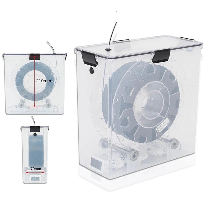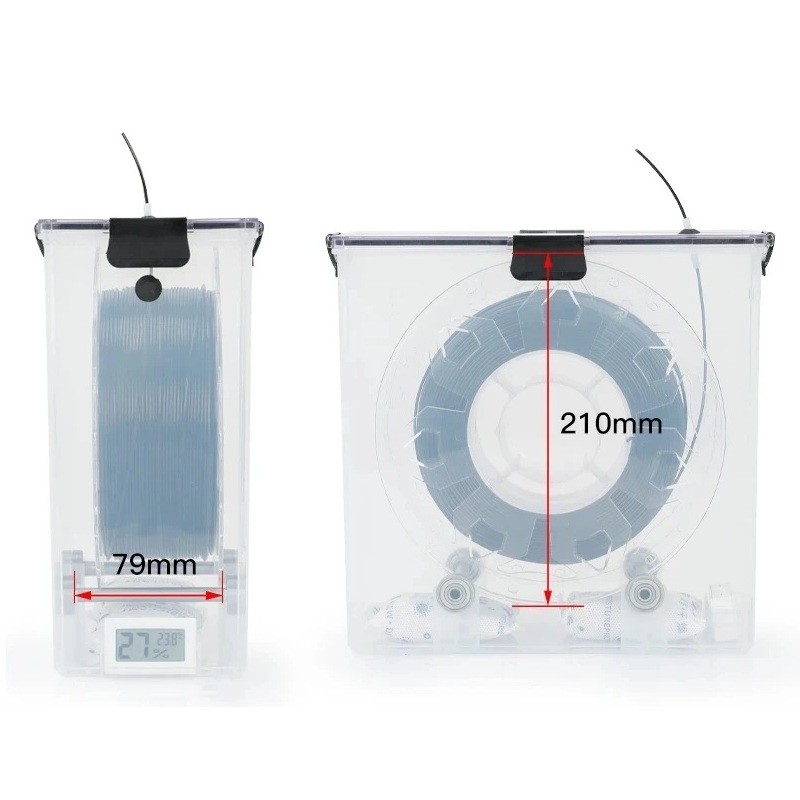 I den nedre delen av lådan finns utrymme för en termometer med fuktighetsindikator, som gör det möjligt att övervaka temperaturen och relativ fuktighet i realtid. Tack vare detta har du alltid koll på under vilka förhållanden filamentet lagras. Enheten levereras utan batteri, som användaren själv får komplettera. På vissa bilder syns torkpåsar, men förpackningen levereras utan fyllning, så att eventuell torkmedel kan väljas och kompletteras efter egna behov. Lådan är tillverkad av hållbar transparent plast, vilket möjliggör enkel visuell kontroll och ger ett rent och modernt intryck.