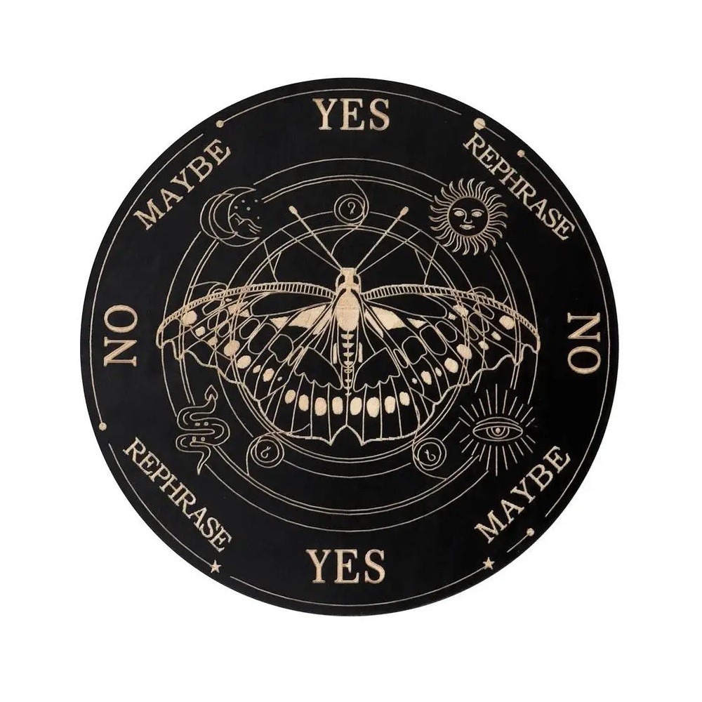 Mystisk träbräda med motiv av nattfjäril, orm och måne används för pendeltolkningar, meditation, andliga ritualer och esoterisk praktik. Fullständig beskrivning