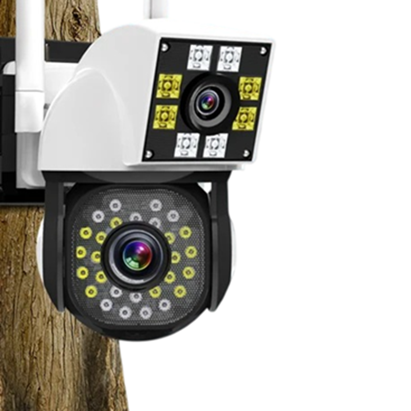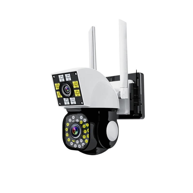 På produktbilden syns kamerans utförande i svart och vitt samt en mobil enhet som antyder möjligheten att övervaka bilden via telefon. Enhetens konstruktion innehåller objektiv och ljusmoduler placerade runt kamerans lins.