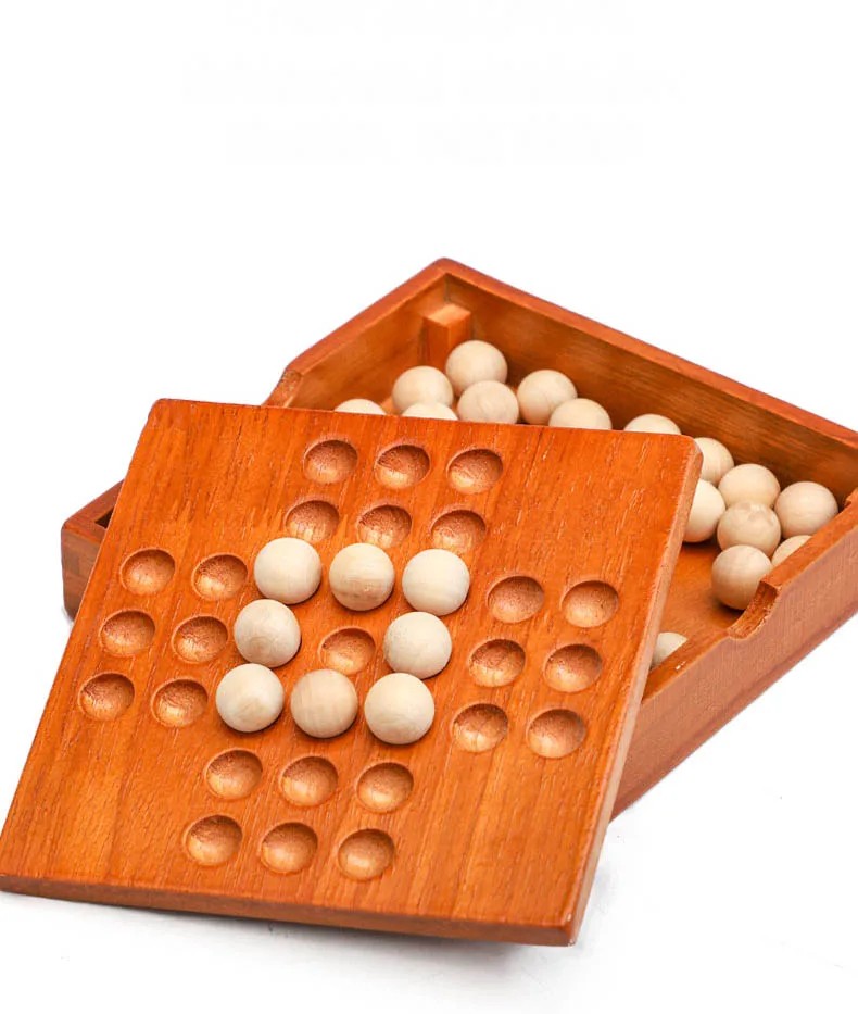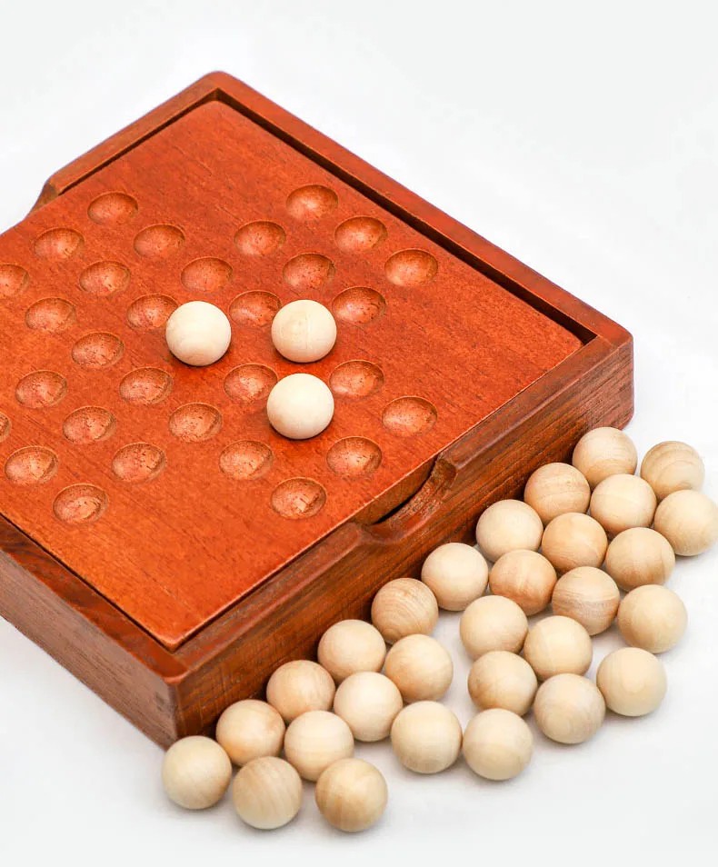 Detta trälogiska brädspel erbjuder ett roligt och utmanande sätt att träna logiskt tänkande och koncentration. Spelarna har som uppgift att hoppa över kulor så att det till slut bara finns en kula kvar av en spelare. Perfekt för alla åldrar, spelet är ett utmärkt val för familjekvällar eller spelande på egen hand. Tack vare den kompakta designen är det lätt att ta med sig och passar för hemmet. Fullständig beskrivning
