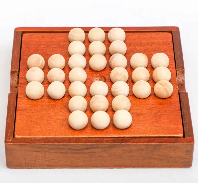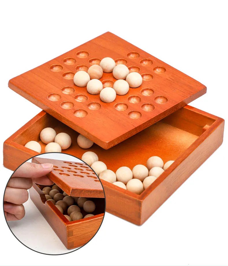 Trälogisk brädspel - hoppa över kulor för 1 spelare Det här trälogiska brädspelet erbjuder ett roligt och utmanande sätt att träna logiskt tänkande och koncentration. Spelarna har som uppgift att hoppa över kulor så att det till slut bara finns en kula kvar av en spelare. Perfekt för alla åldrar, spelet är ett utmärkt val för familjekvällar eller spelande på egen hand. Tack vare den kompakta designen är det lätt att ta med sig och passar för hemmet.
