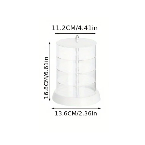 Roterande plastisk organiserare med flera våningar för överskådlig förvaring av gummiband, klämmor, smycken och andra små tillbehör. Fullständig beskrivning
