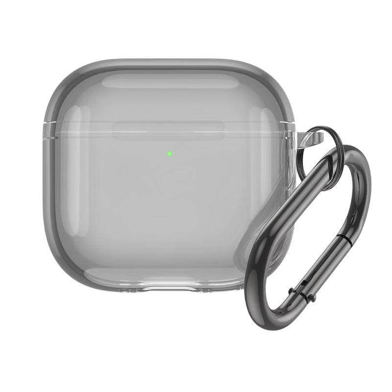 Transparent silikonfodral för AirPods 4 med karbinhake erbjuder omfattande skydd mot fall, visar den ursprungliga designen av hörlurarna och passar exakt på knappar och portar. Fullständig beskrivning