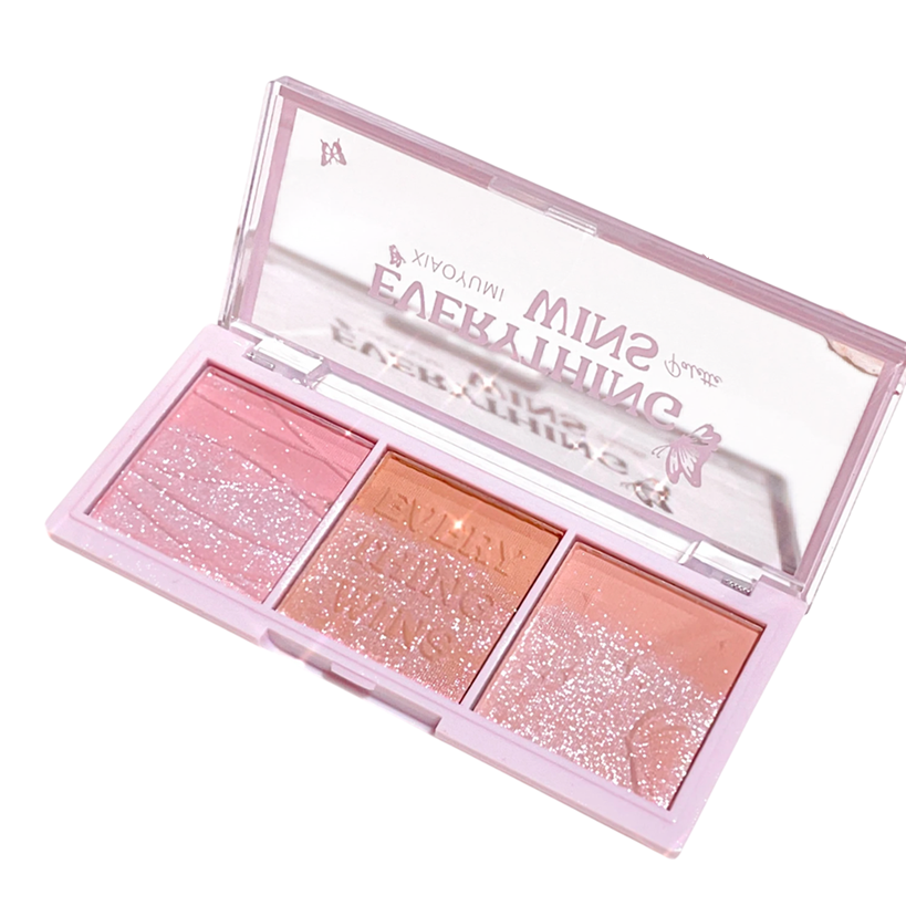 Startsida Startsida Hälsa och skönhet Ansikte Contour, bronzers och highlighters Tre-färgad glittrande rougepalett 3 nyanser Ljusreflekterande långvarigt rouge Ögonskuggor och highlighter Multifunktionell makeup