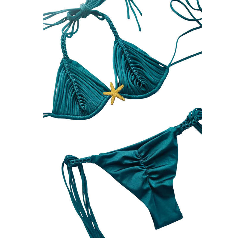 Stil och lekfullhet i ett - denna tvådelade baddräkt är det perfekta valet för varje kvinna som vill glänsa på stranden. Den övre delen är en triangulär topp dekorerad med djärva fransar och knytband i nacken och ryggen, vilket säkerställer en perfekt midjaform. En dekorativ stjärna placeras mellan kopparna, vilket ger modellen en somrig touch och en unik stil. Trosorna har stringtrosor och justerbara dragsko i sidorna för maximal komfort och stil. Hela modellen är perfekt för att sola, fotografera stranden eller koppla av vid poolen.