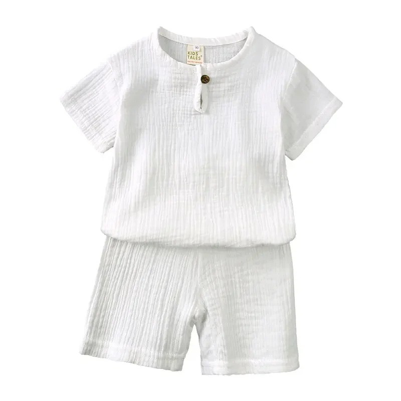Unisex barn set i enfärgad t-shirt med kort ärm och shorts med resår Knappar i halsringningen Rund hals