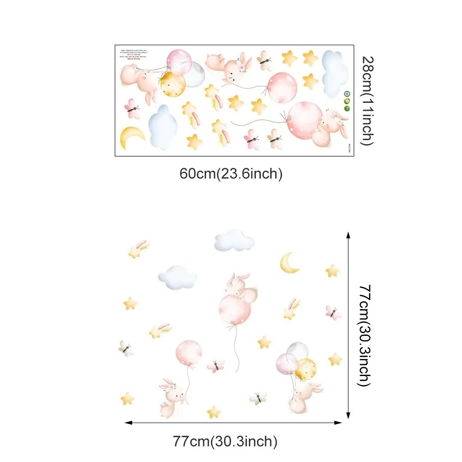 Startsida Startsida Hus och hushållsartiklar Dekorationer och hemtillbehör Tapeter och klistermärken Dekorativa klistermärken Väggdekal 77 x 77 cm Kaniner med ballonger Genomskinlig barnväggdekoration i matt vinyl Söt och fin inredning för rummet