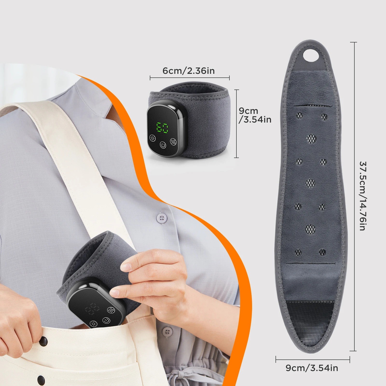 Ortosen har en längd på 37,5 cm (14,76") och en bredd på 9 cm (3,54"), där delen som omsluter handleden är cirka 9 cm hög och det inre omfånget efter att ha stängt kardborrebandet är runt 6 cm (2,36"). Den breda värmepanelen omsluter handleden nästan helt, så att värmen verkar jämnt från både ovansidan och undersidan. Det inre fleecefoder är behagligt mot huden och håller värmen, medan det yttre lagret av slitstark elastisk väv är vindresistent och samtidigt andningsbart. Ortosen är lätt, enkel att packa och får plats i en väska eller ryggsäck, så att du alltid kan ha den till hands hemma, på kontoret eller på resande fot.