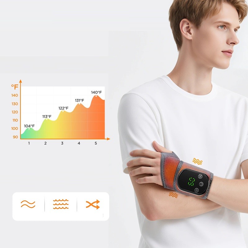 Värmeortos för handleden 5 temperaturnivåer 3 vibrationslägen 37,5 x 9 cm LCD-display USB-C-laddning 1800 mAh batteri automatisk avstängning