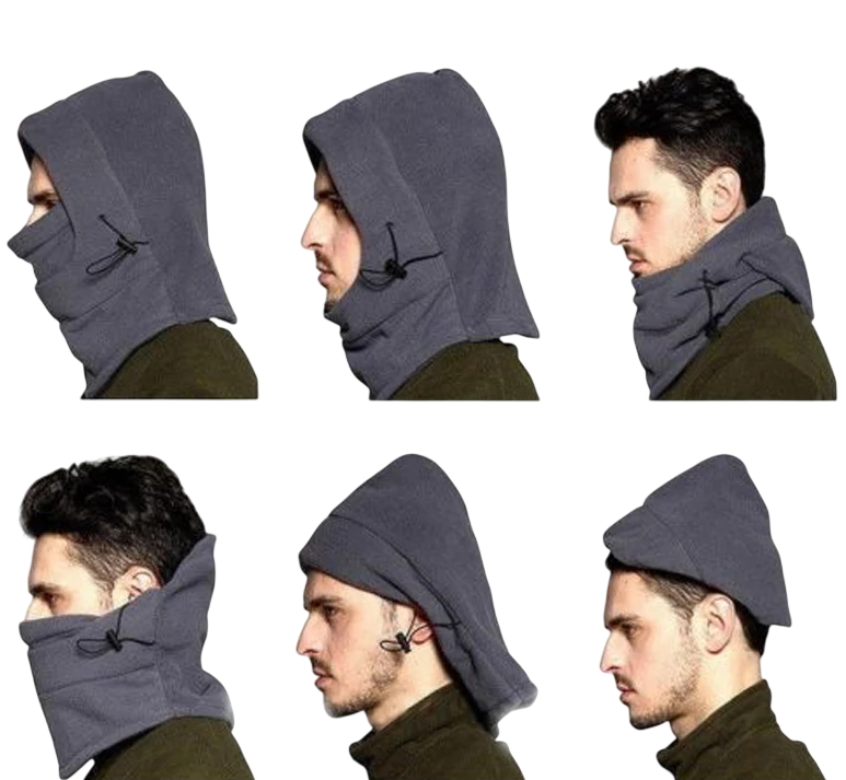 Termisk fleecehuva av polyester med snöre för åtstramning hjälper till att skydda huvudet, ansiktet och halsen vid kallt väder. Fullständig beskrivning